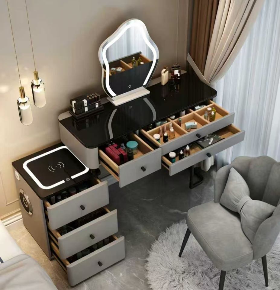 Tocador Inteligente de Cristal con Carga Inalámbrica, Espejo Ajustable y Almacenamiento - Mueble de Dormitorio Nórdico de Lujo Moderno y Minimalista