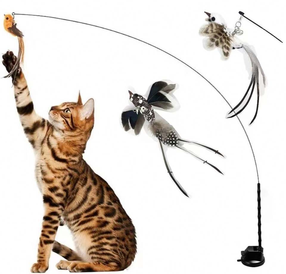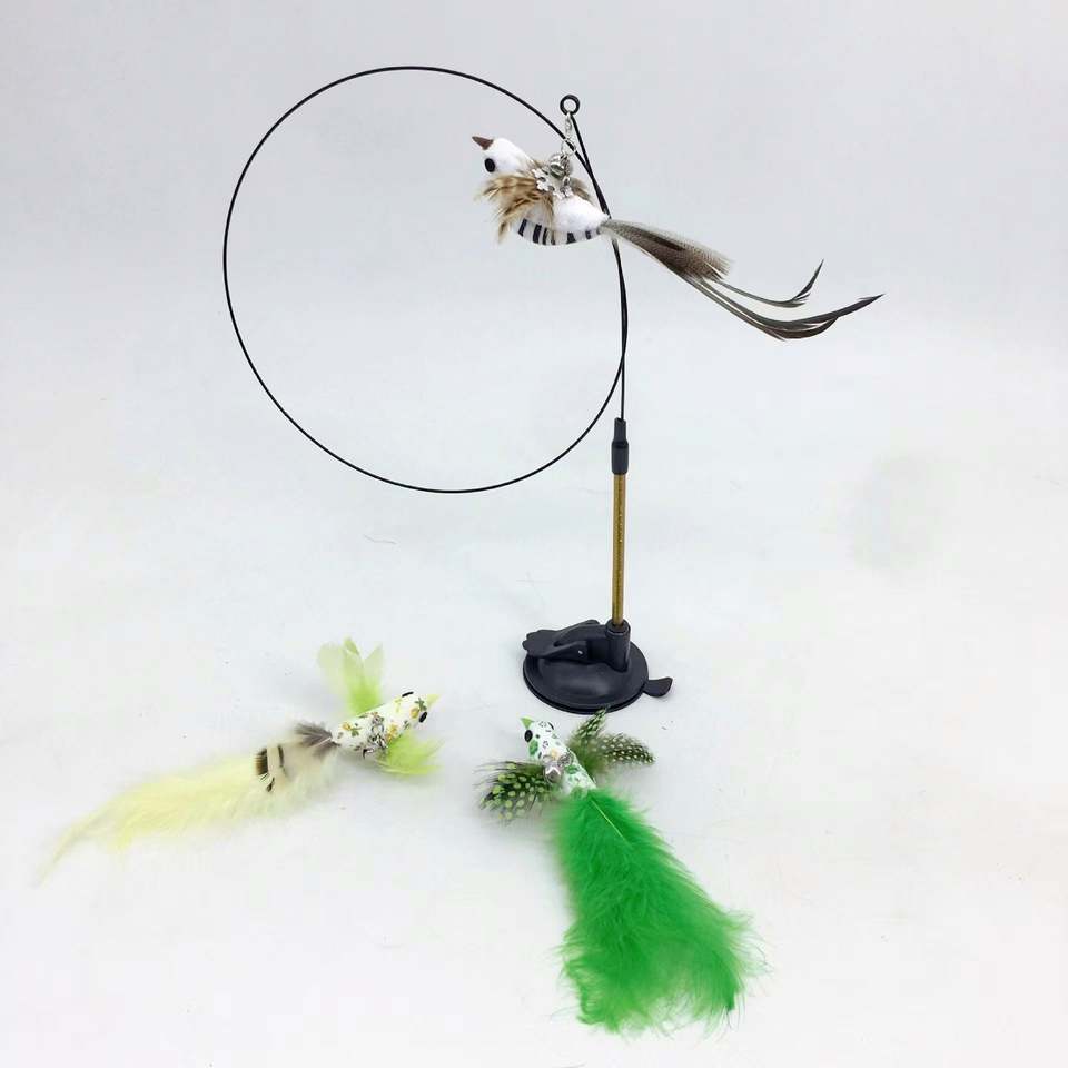 Juguete Interactivo para Gatos con Simulación de Pájaro, Plumas Coloridas Realistas, Campanas en Varita, Base de Succión Autoadhesiva, Estimulante