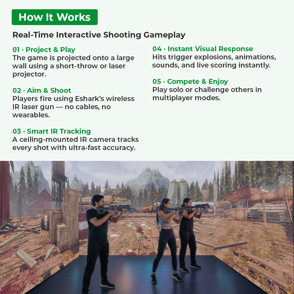 Sistema de Juego Interactivo de Disparos en Pantalla Múltiple con Pistola Láser IR y Detección Inteligente de Objetivos para Zonas de Juego Interiores | INEK00012