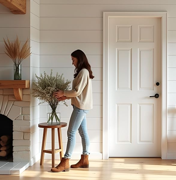 Puerta Interior de Diseño Moderno con Núcleo Sólido de Madera de Nogal, Revestimiento de PVC Laminado, MDF y Tiras Metálicas Resistentes a la Humedad
