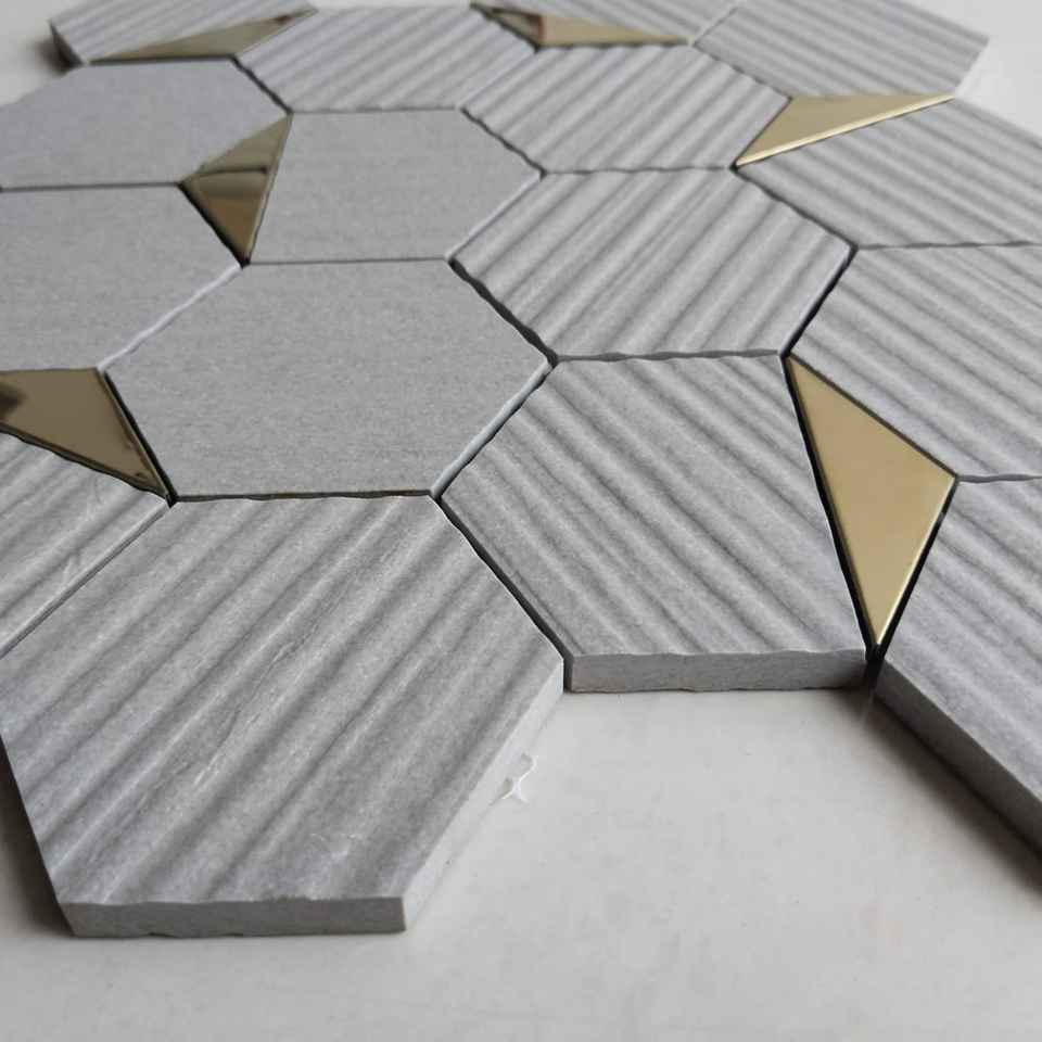 Mosaicos de pared interior 3 pulgadas 73mm delfín hexagonal único moderno Metal oro piedra vidrio mate cerámica malla porcelana Baño