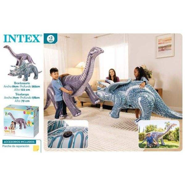 Dinosaurios inflables gigantes Intex de 264 cm (Brontosaurio) y 178 cm (Triceratops) para la diversión de los niños.