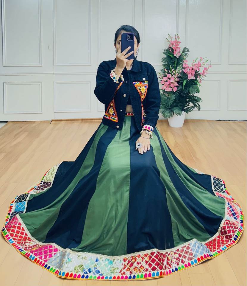 Chaqueta de mezclilla de trabajo Gamathi bordada intrincadamente exquisita Lisa pura Reyon Lehengha para estilo Navratri indio pakistaní
