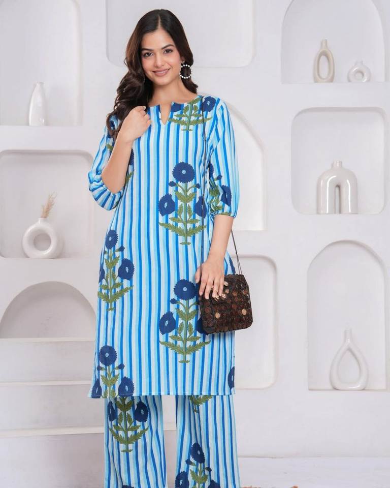 Presentamos nuestro conjunto de diseñadores, una combinación perfecta de tradición y tendencia. Este A-ine Kurti se combina con pantalones hasta los tobillos.