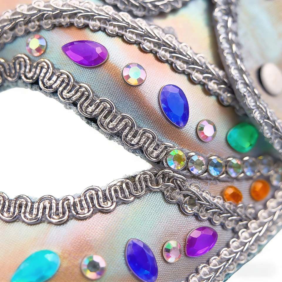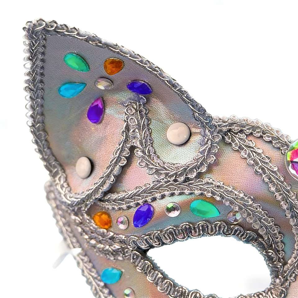 Máscara de Gato Plateada Iridiscente de Plástico para Fiesta de Halloween con Pedrería Multicolor, Media Cara
