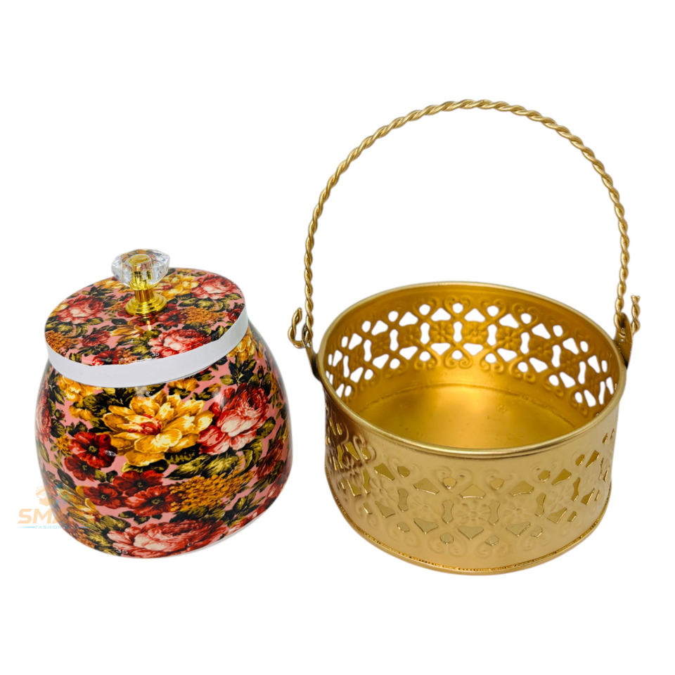 Tarro de fruta seca con diseño Pichwai impreso en hierro con juego de cesta para almacenamiento de alimentos decorativos y regalos