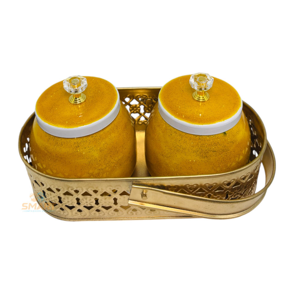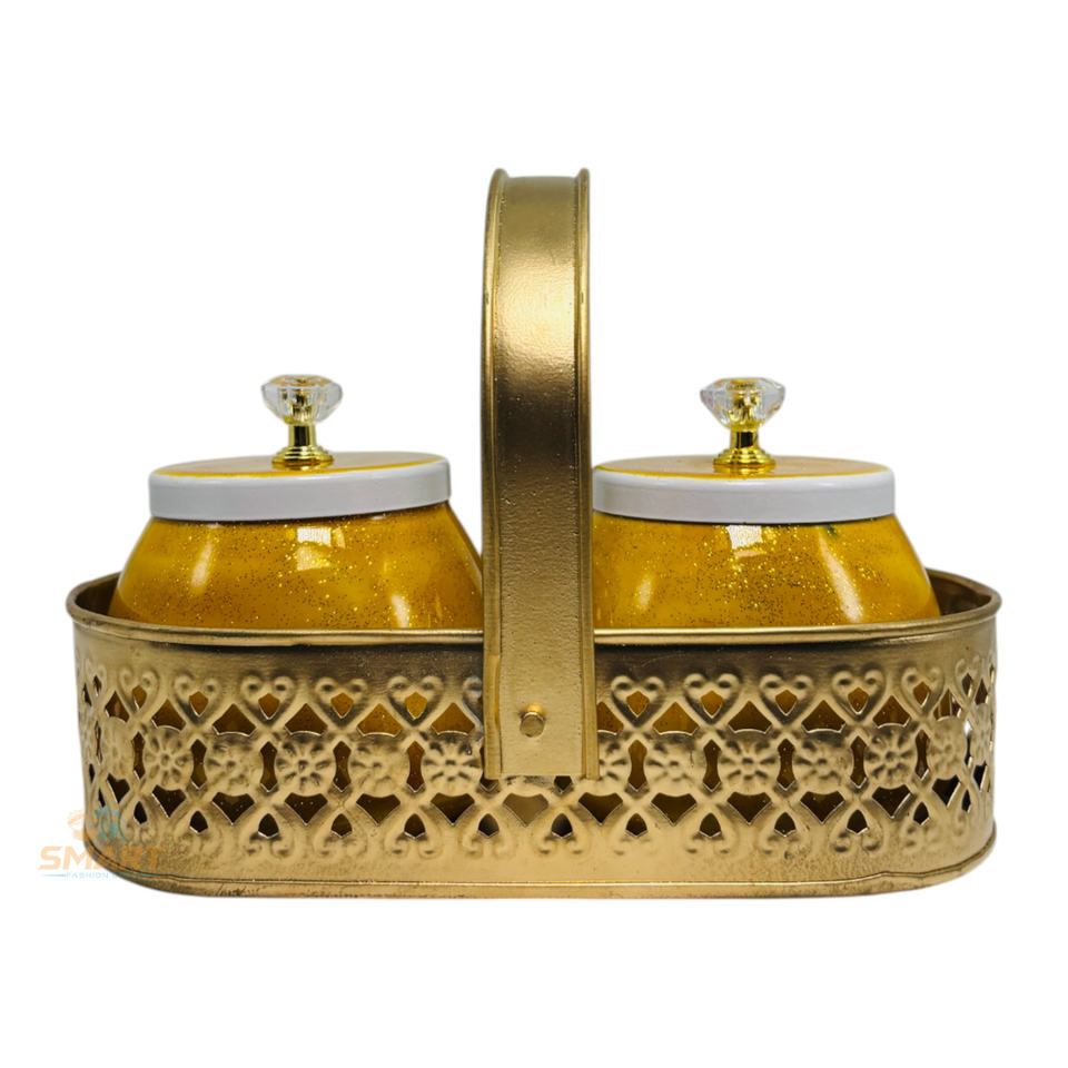Tarro de fruta seca con diseño Pichwai impreso de hierro con juego de cesta festiva, contenedor de almacenamiento de alimentos de cocina y regalo esencial