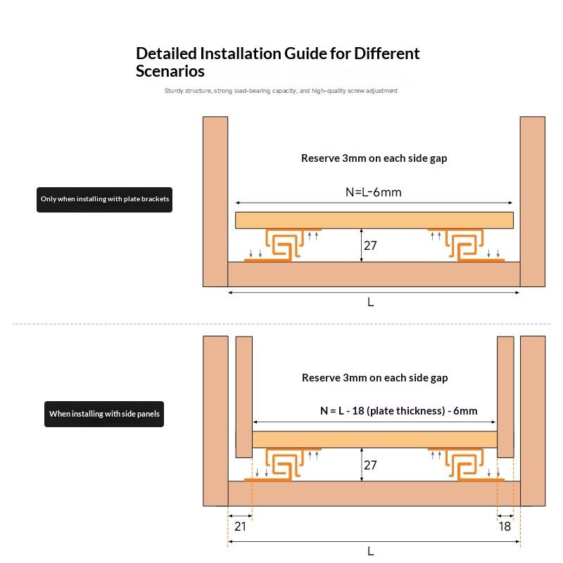 Rieles Deslizantes de Tres Secciones con Amortiguación Inferior para Gabinetes, Muebles de Exhibición de Joyería, Riel Silencioso Oculto BG045