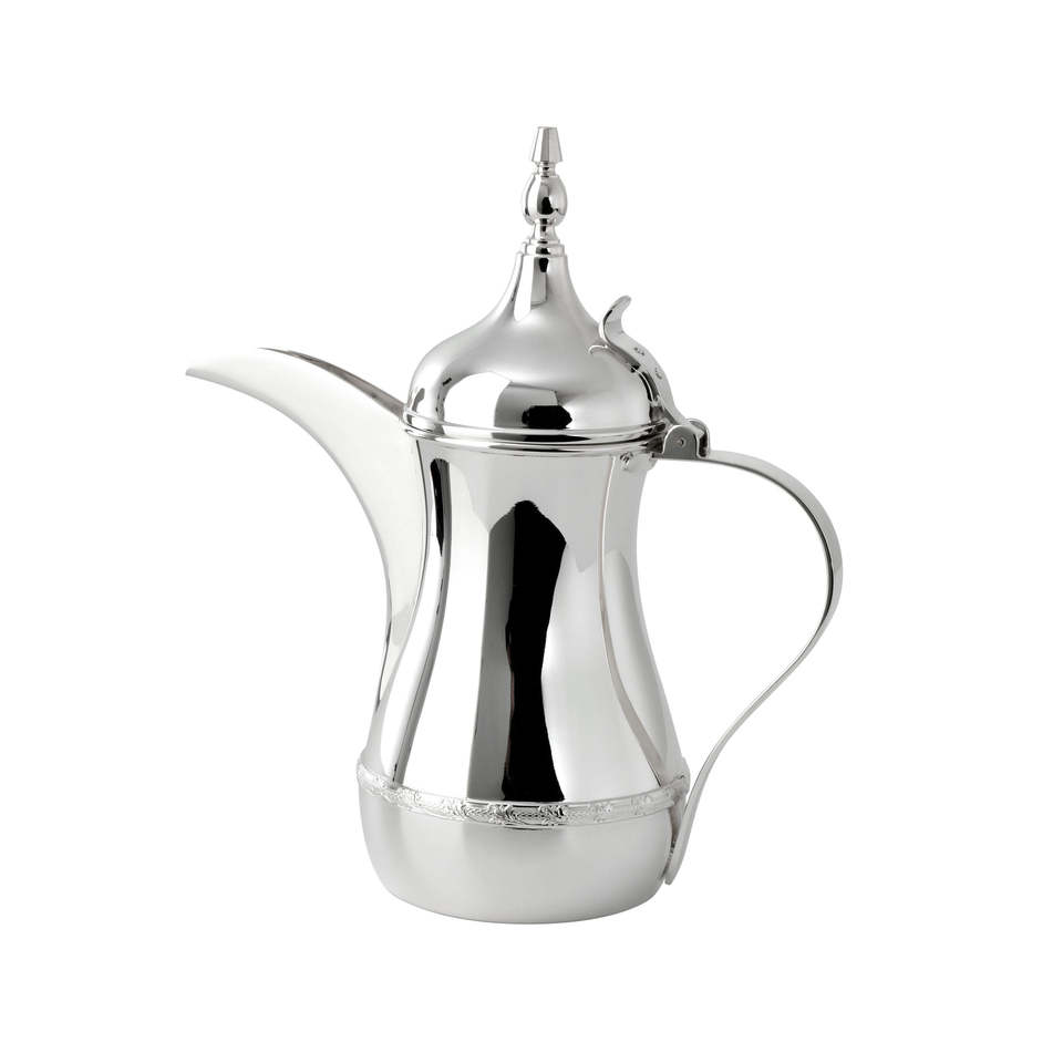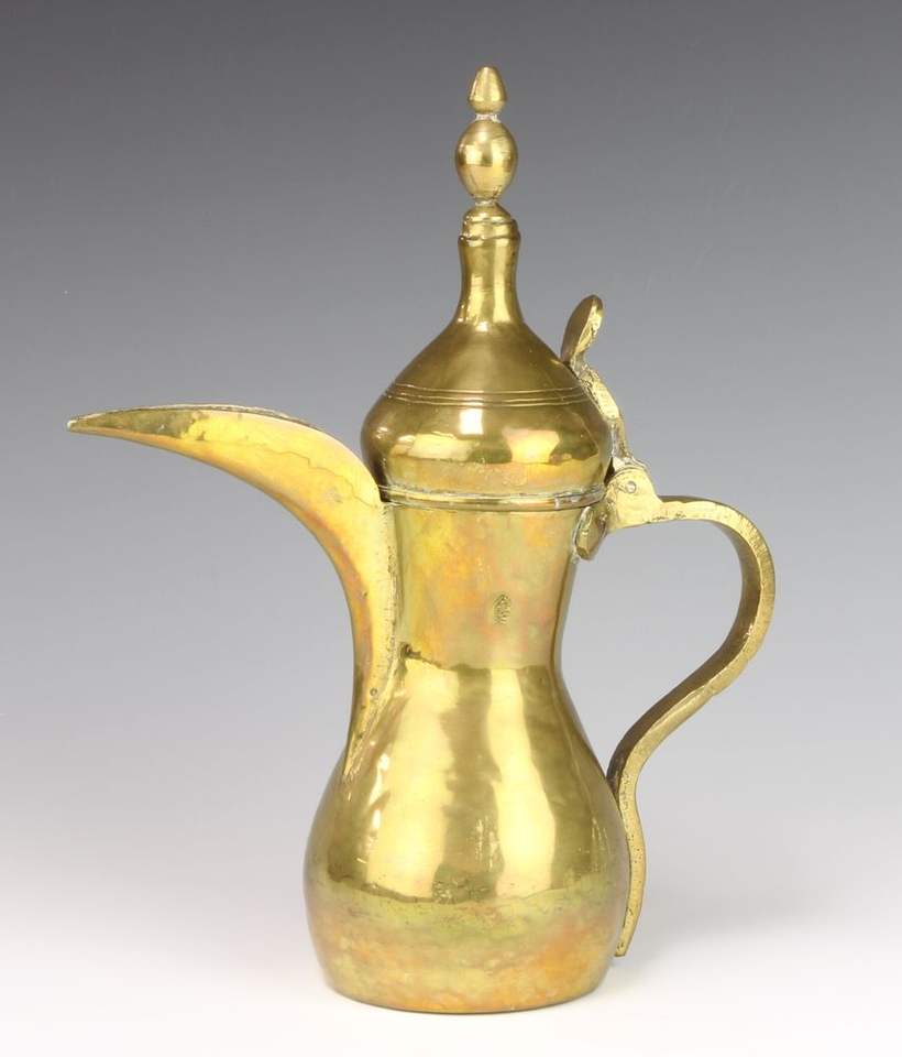Cafetera y tetera islámica tradicional de metal, estilo Dallah árabe, hecha a mano, decorativa, para servir en la cocina.