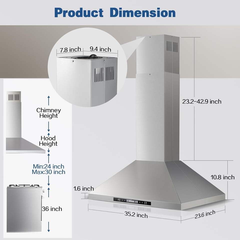 Campana Extractora Island de 36 Pulgadas, 700 CFM, Montaje en Techo, Convertible con/Sin Ducto, Control Táctil con Sensor de Gestos