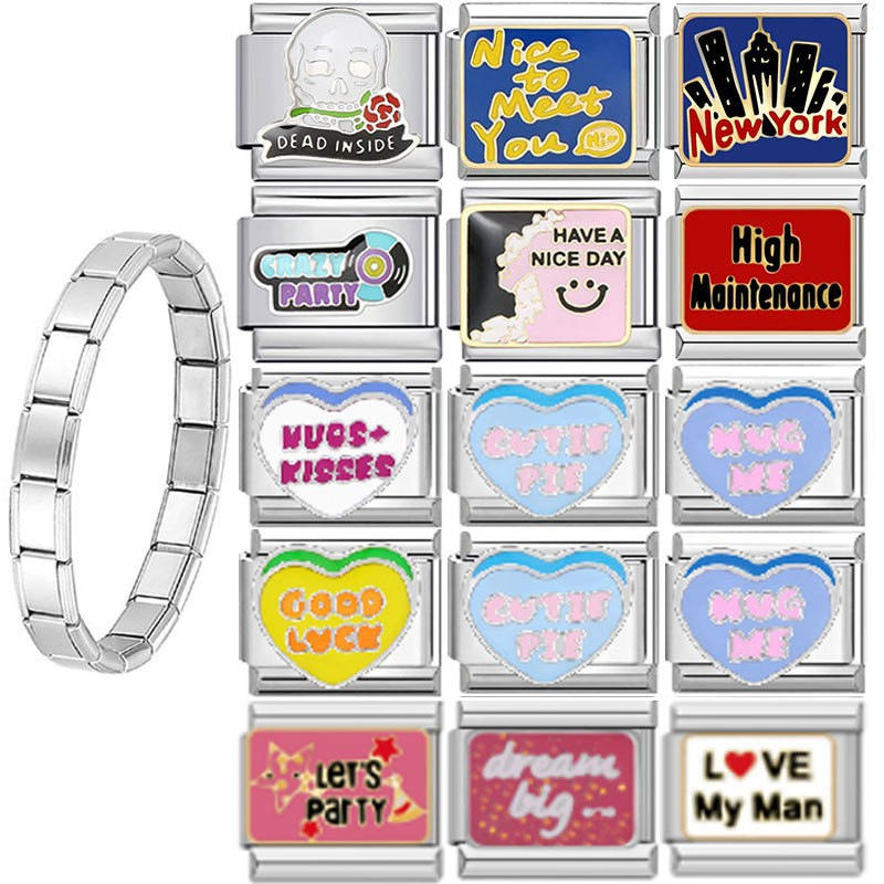 Pulsera Modular Italiana de Acero Inoxidable con Dijes, Unisex, para Uso Diario, con Diseño de Corazón y Engaste de Bisel