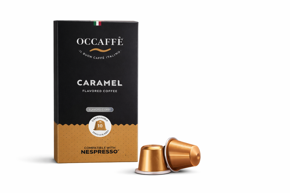 Cápsulas Compatibles con Cafeteras Italianas de Aluminio Occaffe, Caramelizadas, Caja de 10 Cápsulas en un Cartón para Café