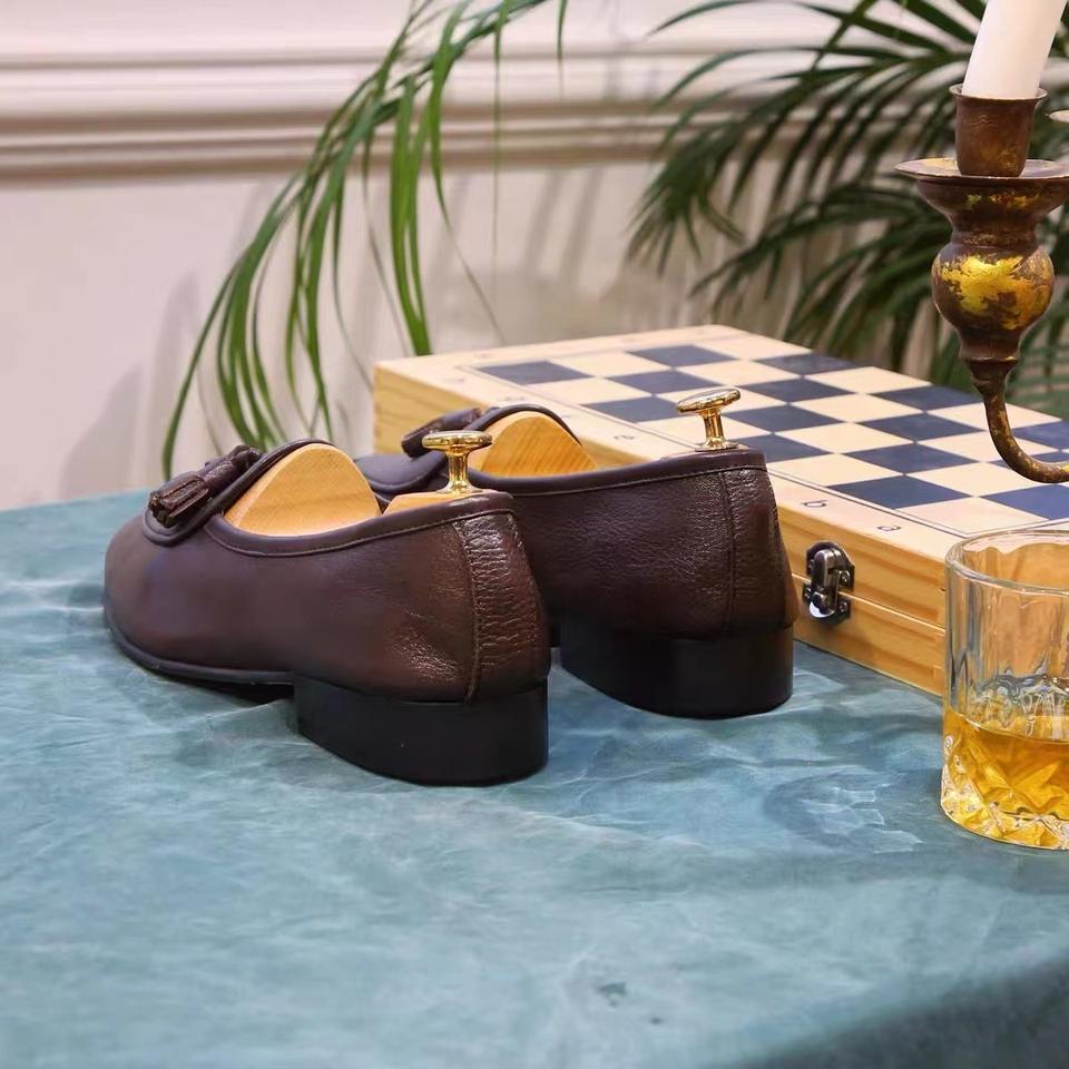 Italiano Retro Grano Cuero Británico Full Grain Cuero de vaca Cómodo Versátil Slip On Traje Borla Mocasines