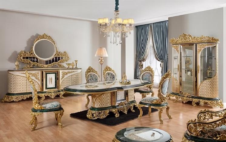 Juego de Comedor Profesional de Estilo Italiano Clásico en Madera de Teca con Acabado Dorado, Lujoso Juego de Comedor para 8 Personas con Tamaño Personalizado