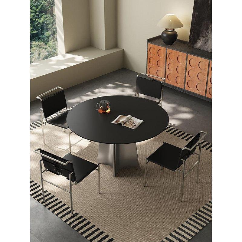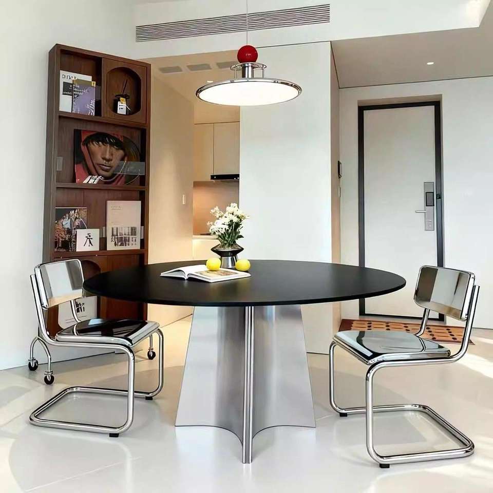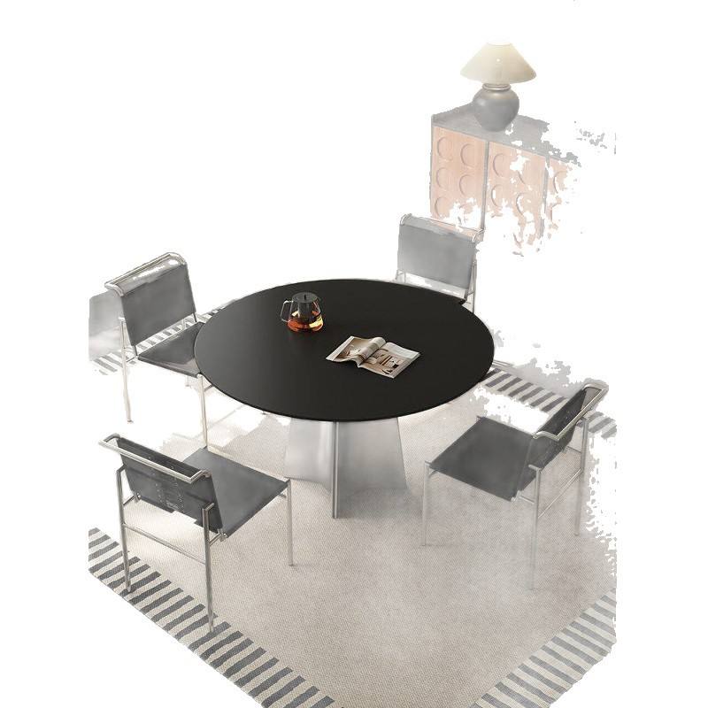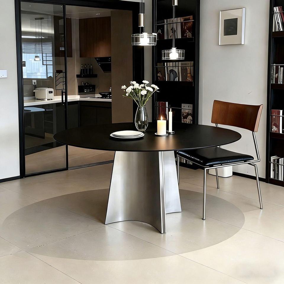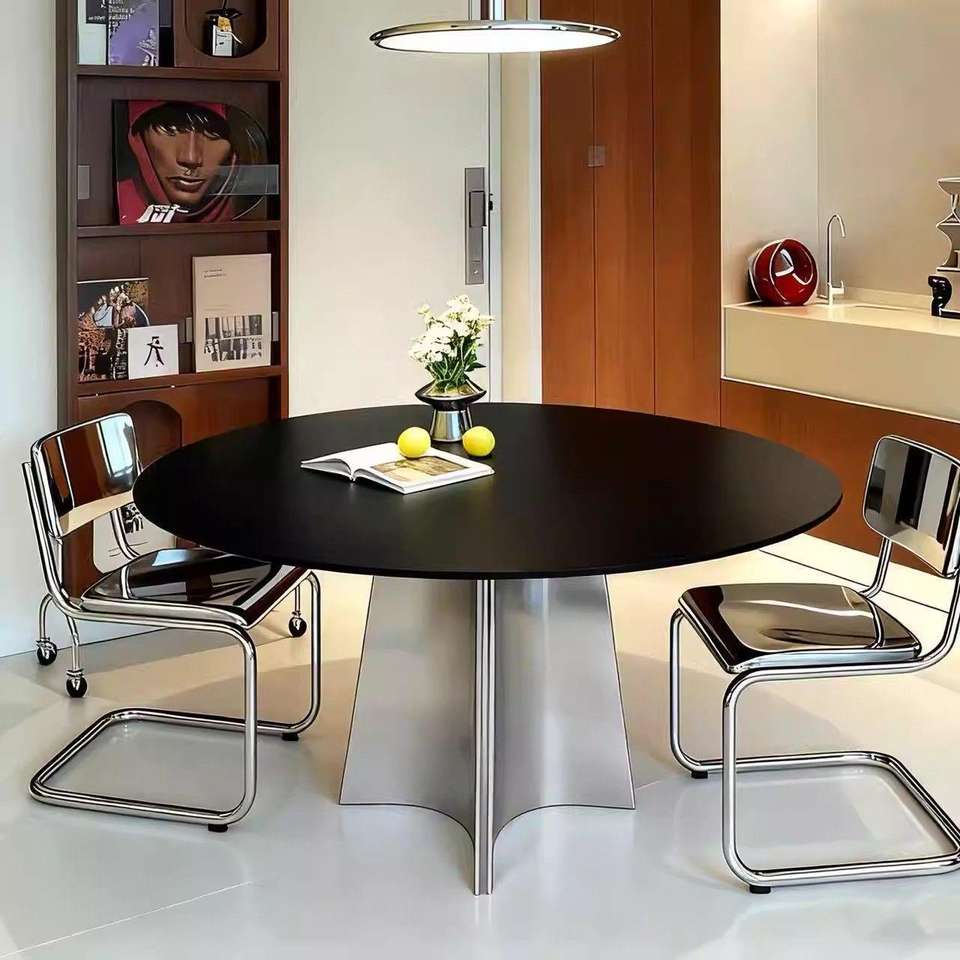 Mesa de Comedor Redonda Estilo Italiano con Tapa Negra y Patas de Acero Inoxidable, Giratoria, Diseño Moderno para el Hogar y Apartamentos Pequeños