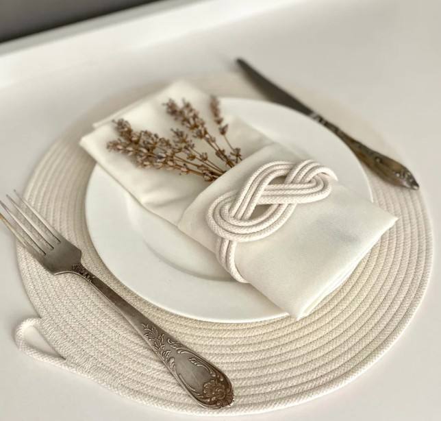Manteles individuales de cuerda de algodón color marfil: Posavasos rústicos estilo bohemio, regalo de anillo para servilletas