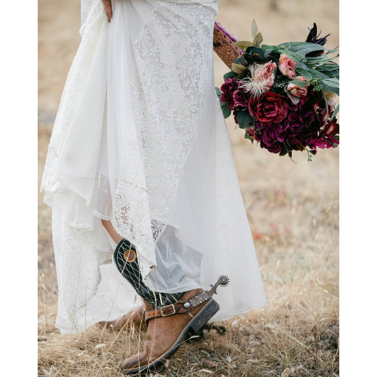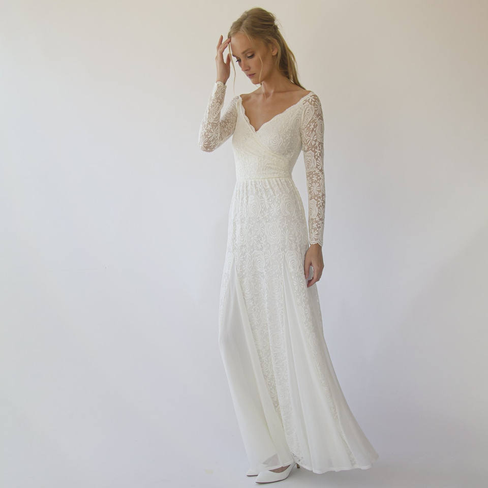 Vestido de novia sirena color marfil con hombros descubiertos y mangas largas cruzadas # 1280