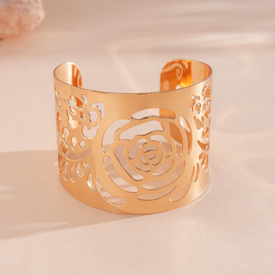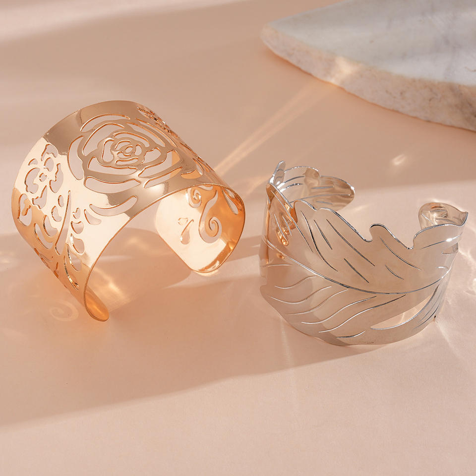 Brazalete Abierto de Acero Inoxidable Liso con Diseño de Hoja y Flor Estampada, Unisex, Estilo Vintage Exagerado, Personalidad, Lujo, Moda, Fiesta