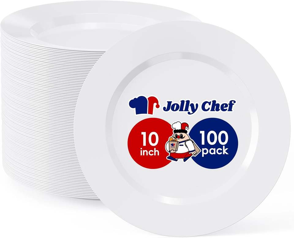 JOLLY CHEF - 100 Platos de Plástico Blancos - Plato de Plástico Desechable Elegante de 10 Pulgadas