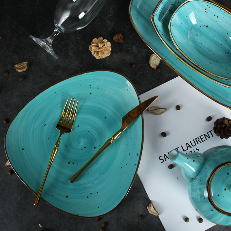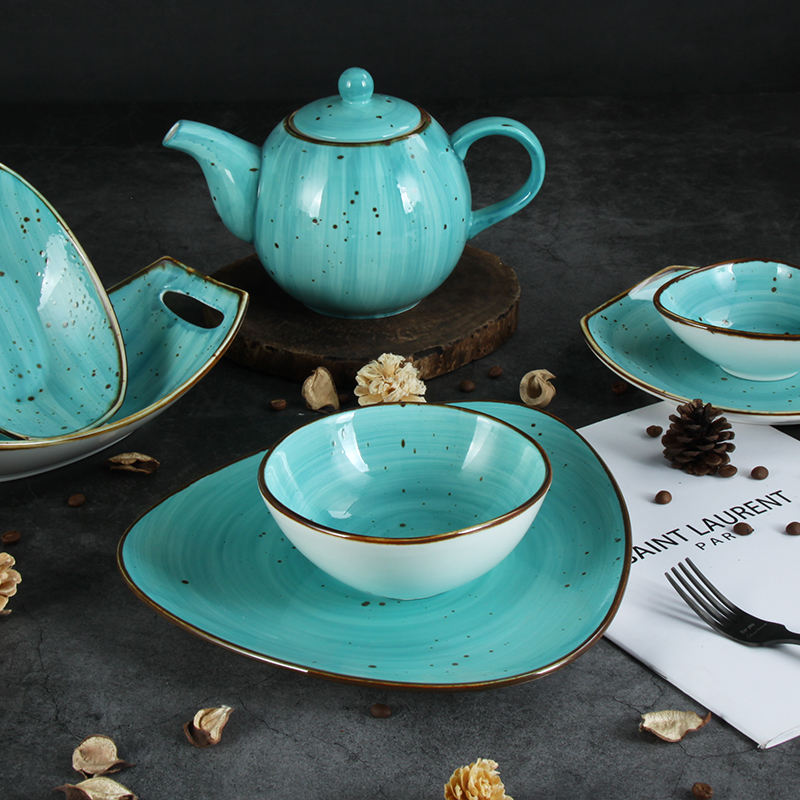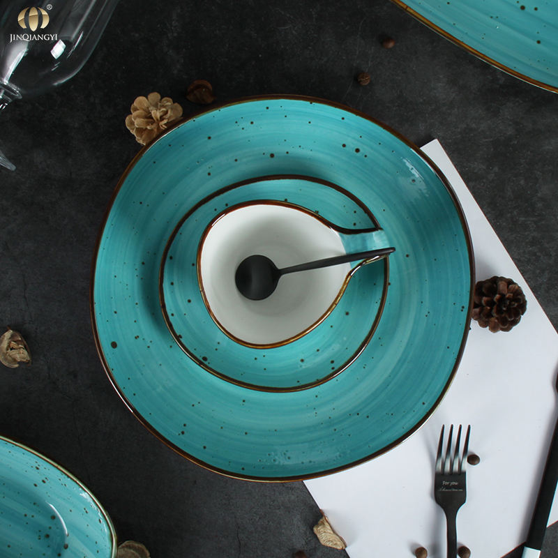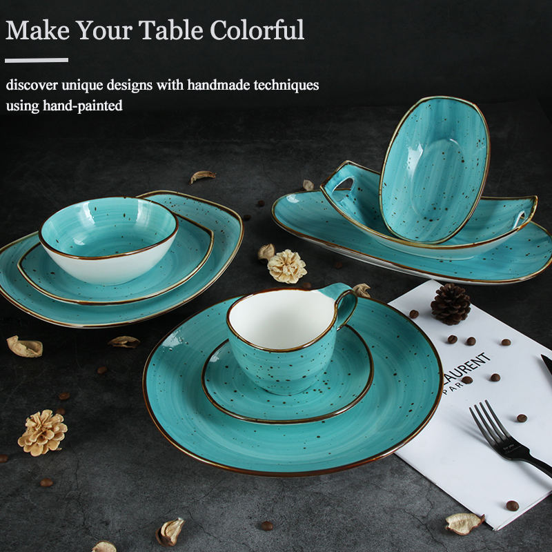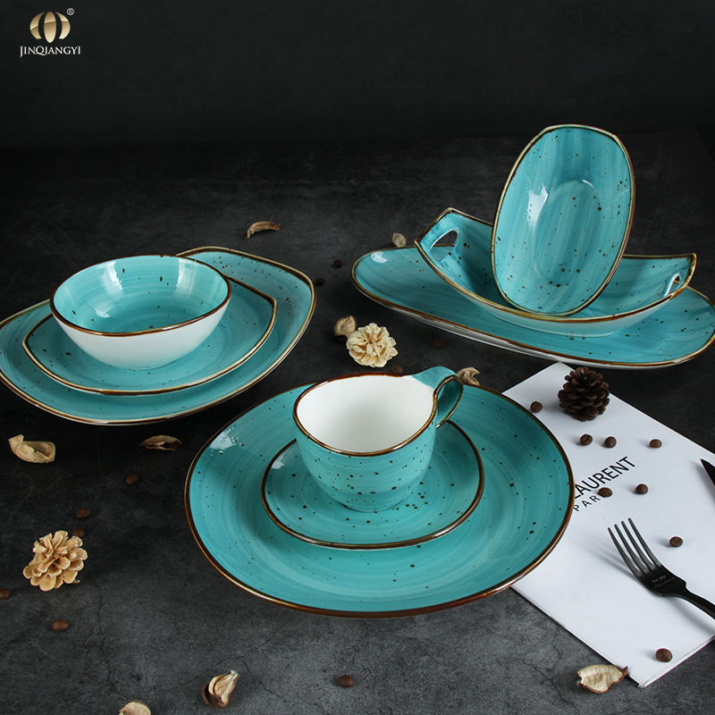Juego de Vajilla de Cerámica Pintada a Mano Estilo Retro JQY con Platos, Tazones y Tazas, Vajilla de Porcelana Esmaltada en Turquesa