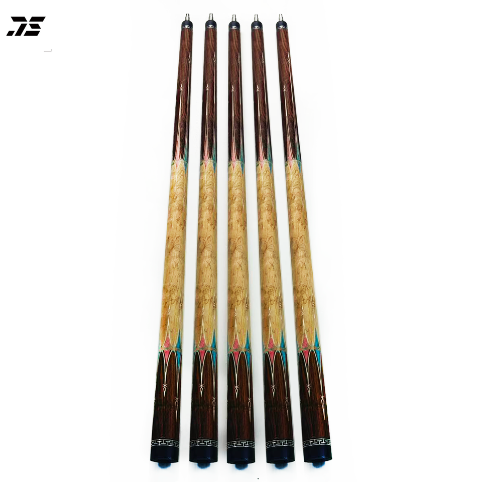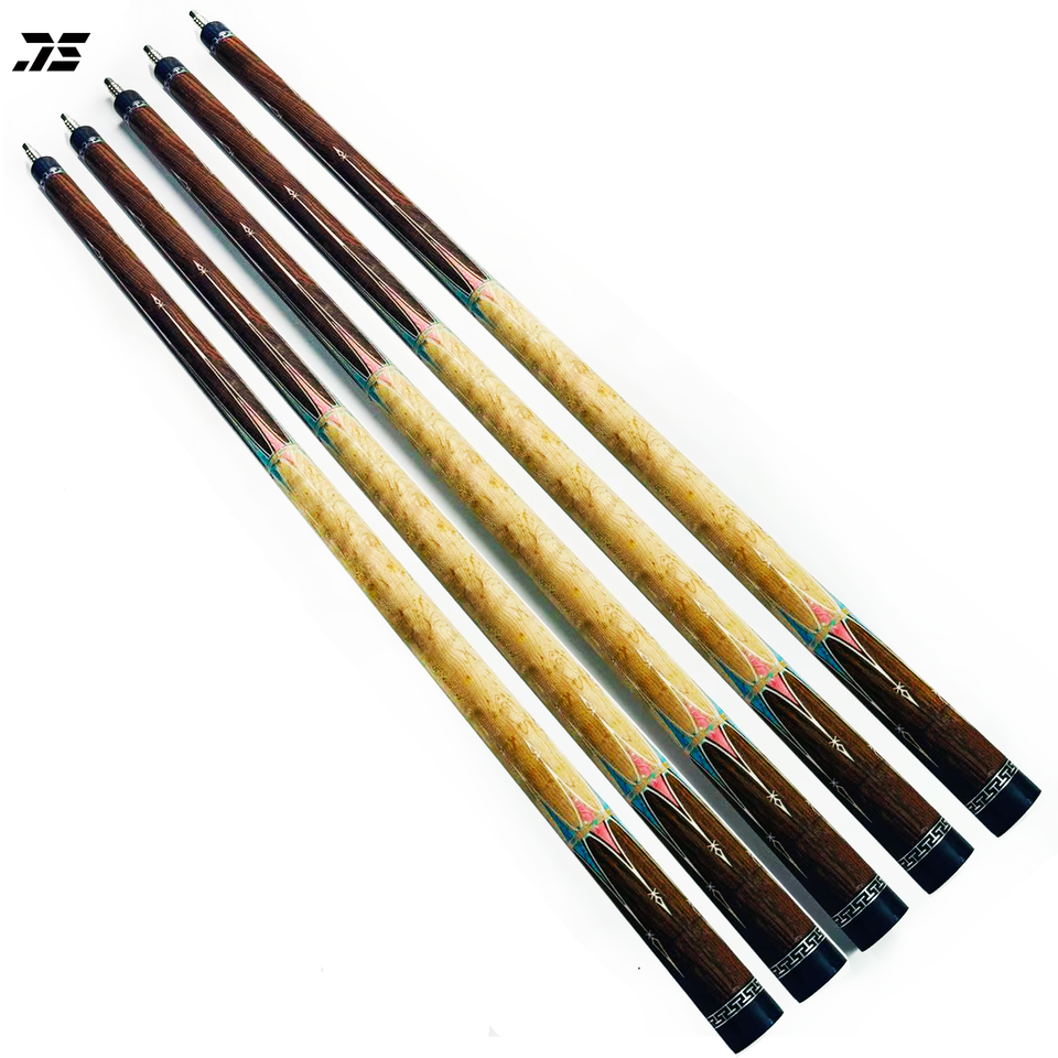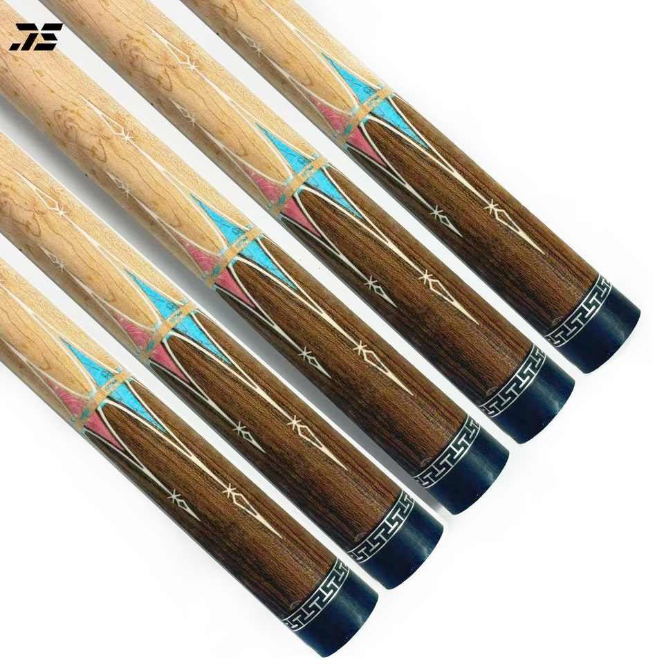 Taco de Billar JS con Diseño de Patrón Acrílico en Blanco, Azul y Rosa con Incrustaciones de Arce Ojo de Pájaro