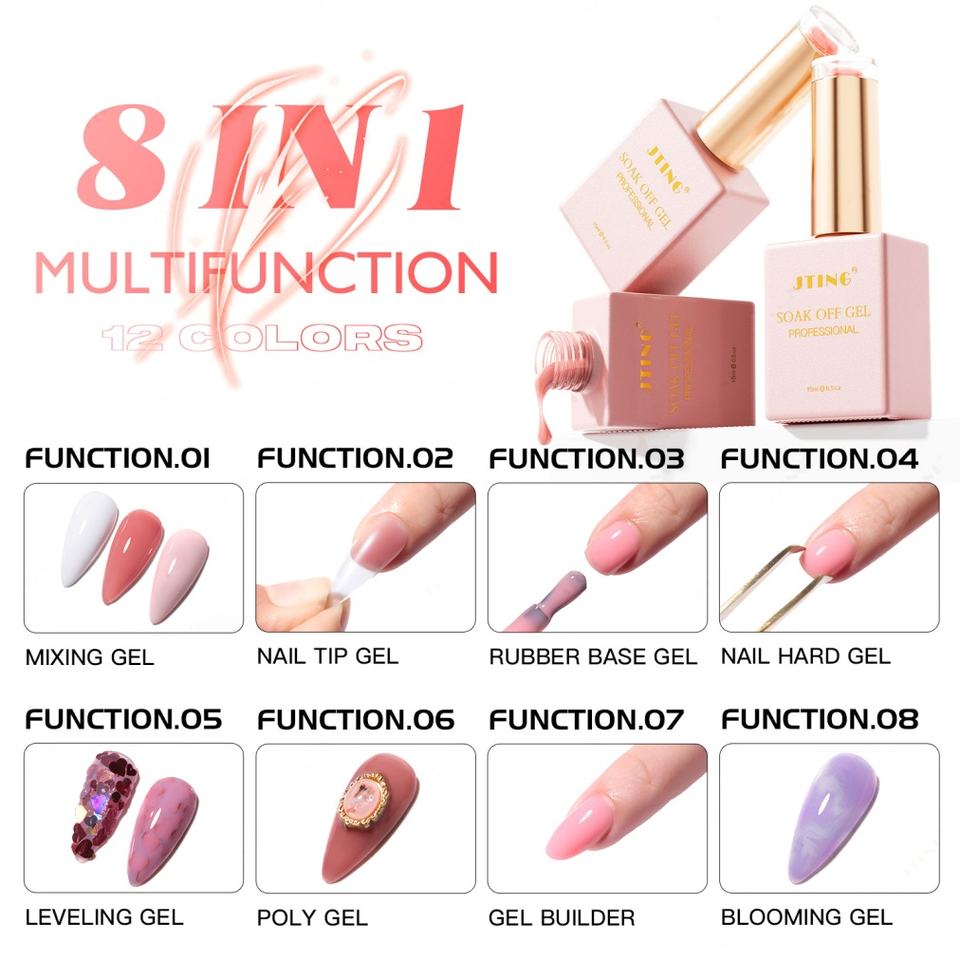 JTING Esmalte de Uñas en Gel Multifunción 8 en 1 con Efectos Universales, Mezcla y Difuminación, 12 Colores, Libre de Crueldad Animal, Gel Polivalente Autonivelante