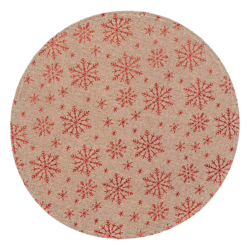 MANTO DE MESA DE POLIÉSTER CON EFECTO YUTE Y COPOS DE NIEVE ROJOS 38CM