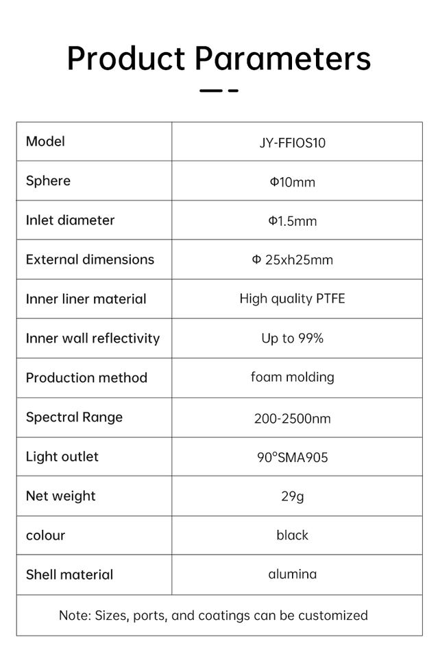 Esfera Integradora de Transmitancia JY-FFIOS10, Diámetro 10mm, PTFE, 99% de Reflectancia, 200-2500nm, SMA905