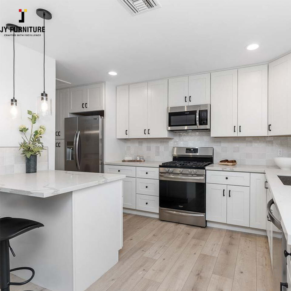 Gabinete de Cocina de Melamina de Estilo Europeo de Alta Gama Personalizado por JY Project, Diseño Moderno Shaker, Modular, con Cajones Deslizantes y Bisagras