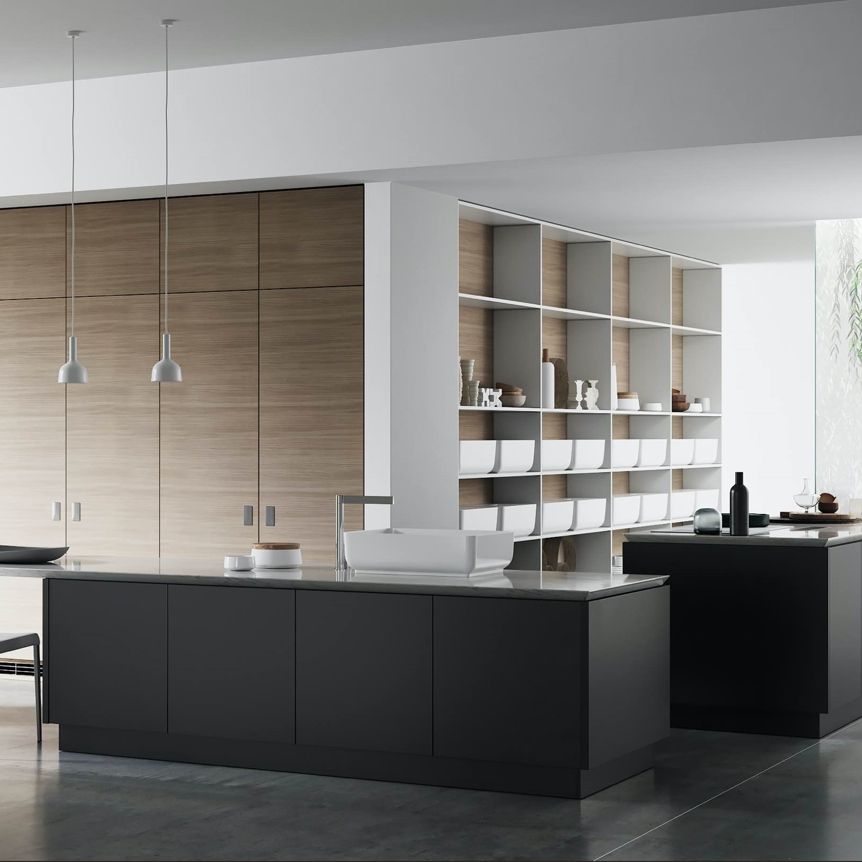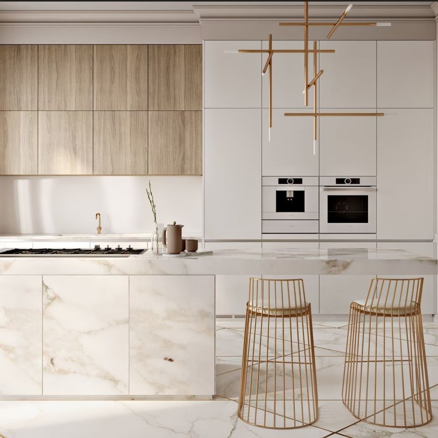 Gabinetes de Cocina Modulares Comerciales RTA de Madera Contrachapada Moderna sin Marco, Estilo Europeo, Personalizados por JY Project, con Grifo de Mármol