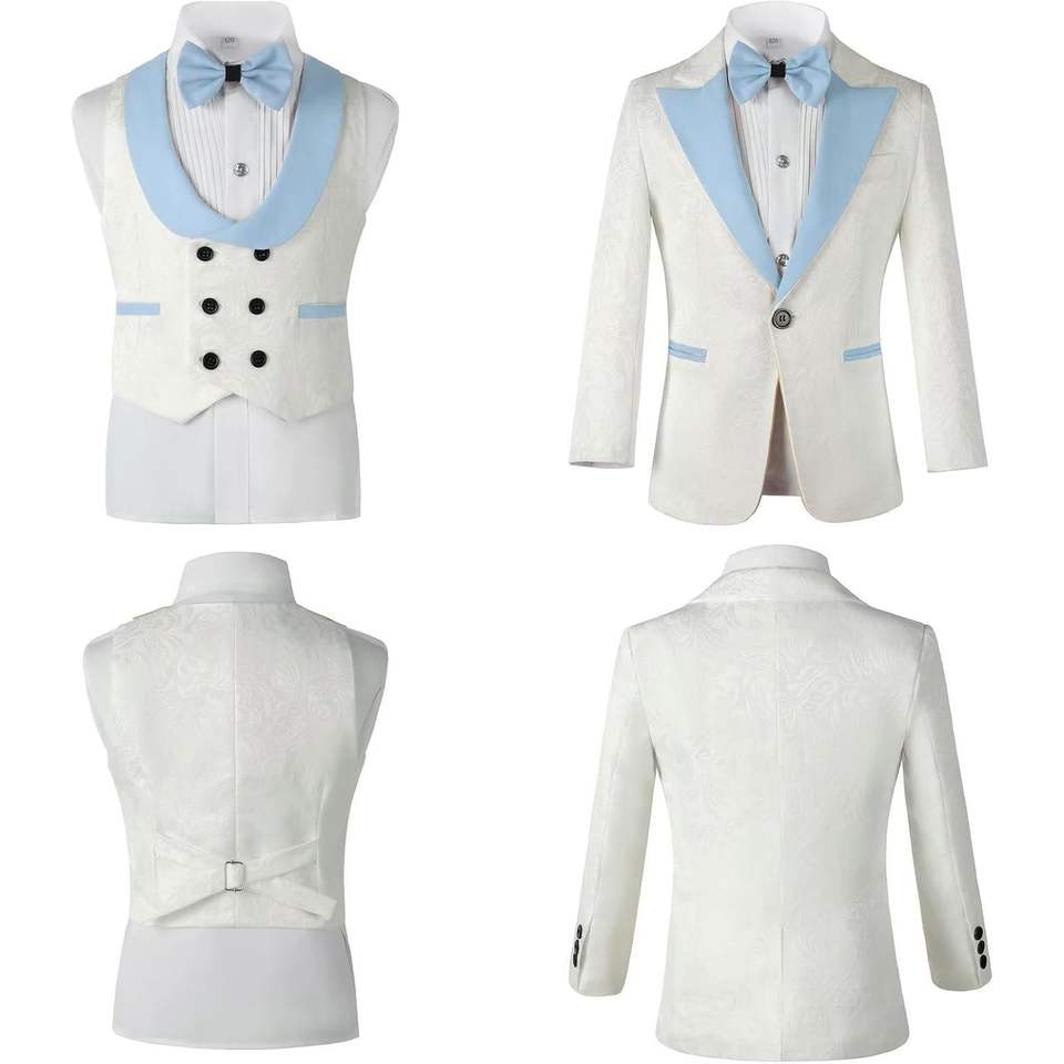 Trajes de esmoquin Jacquard para niños, chaqueta Floral de 3 piezas, pantalones, chaleco blanco-champán para invierno, cumpleaños, cena, fiesta, boda