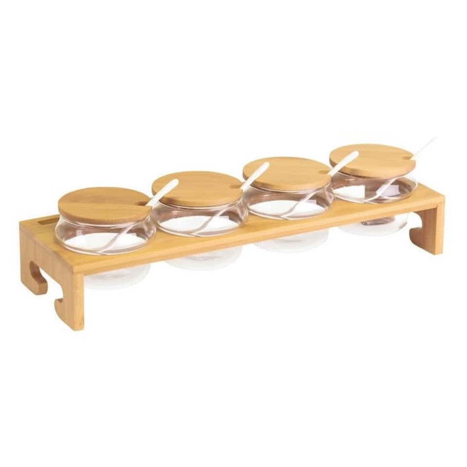Juego de tarros de mermelada con 4 tarros de vidrio, tapas de bambú y soporte para almacenamiento de condimentos