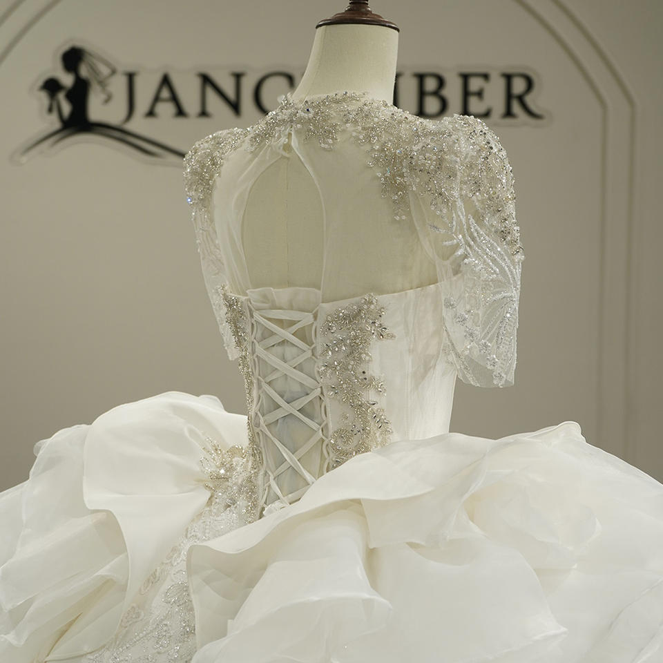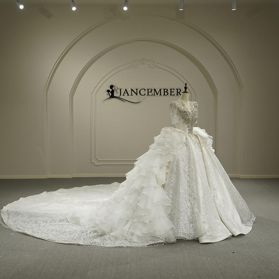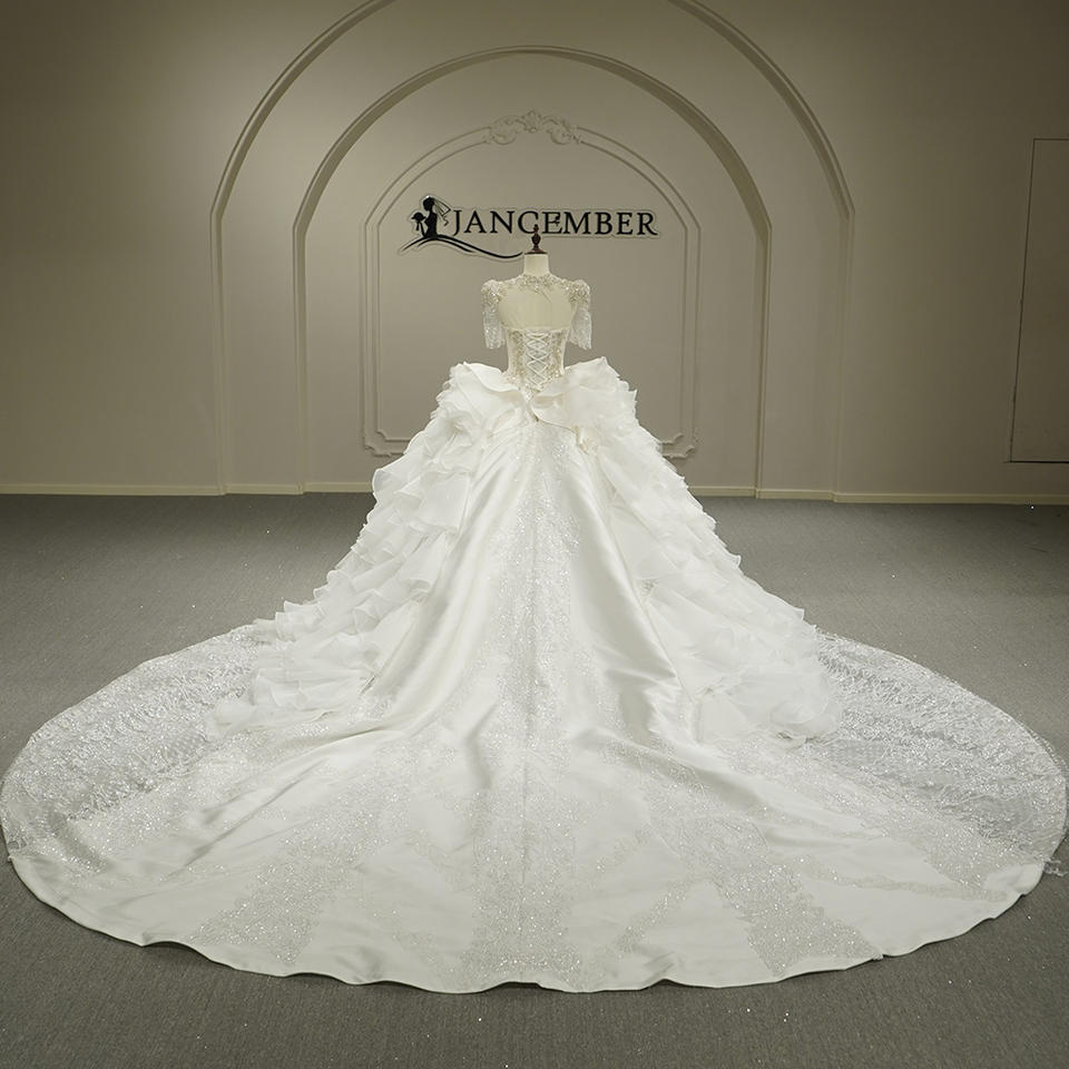 Vestido de Novia Moderno con Cola de Capilla, Escote en V, Volantes, Satén, Bordado de Encaje, Flores con Lentejuelas y Falda Abullonada, Modelo Exclusivo GT26054