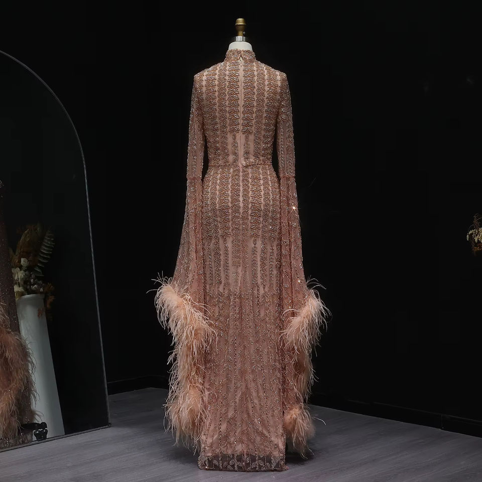 Jancember LSZ088 musulmán cuello alto pluma capa manga hendidura sirena noche graduación