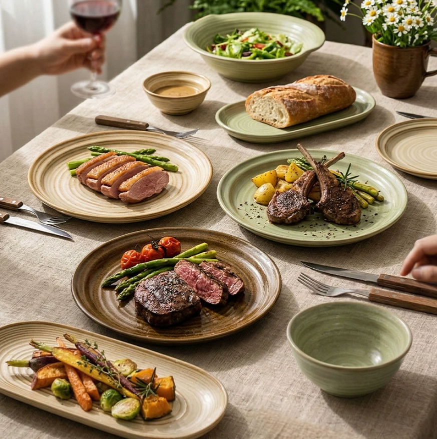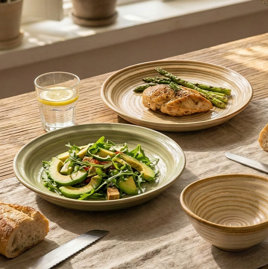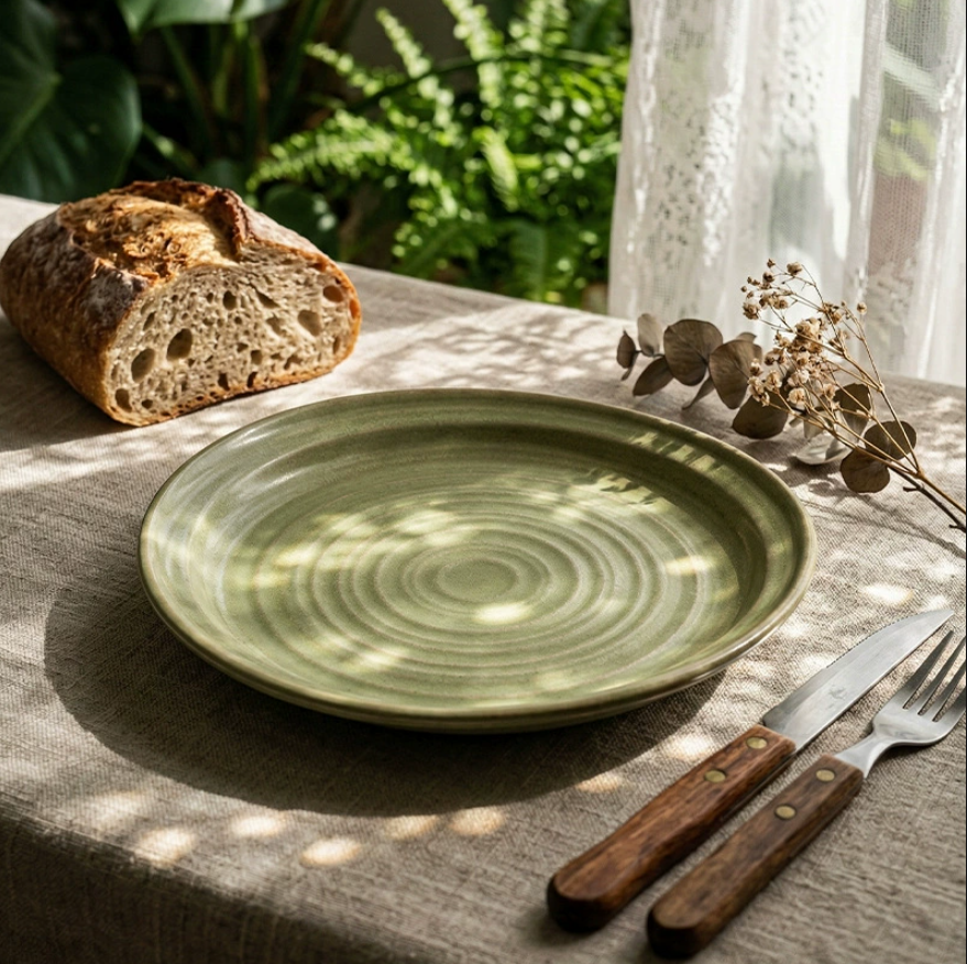 Plato Redondo de Cerámica Estilo Japonés de 8.2 Pulgadas, Esmaltado en Horno, con Textura Acanalada, para Restaurante u Hogar, para Bistec o Ensalada
