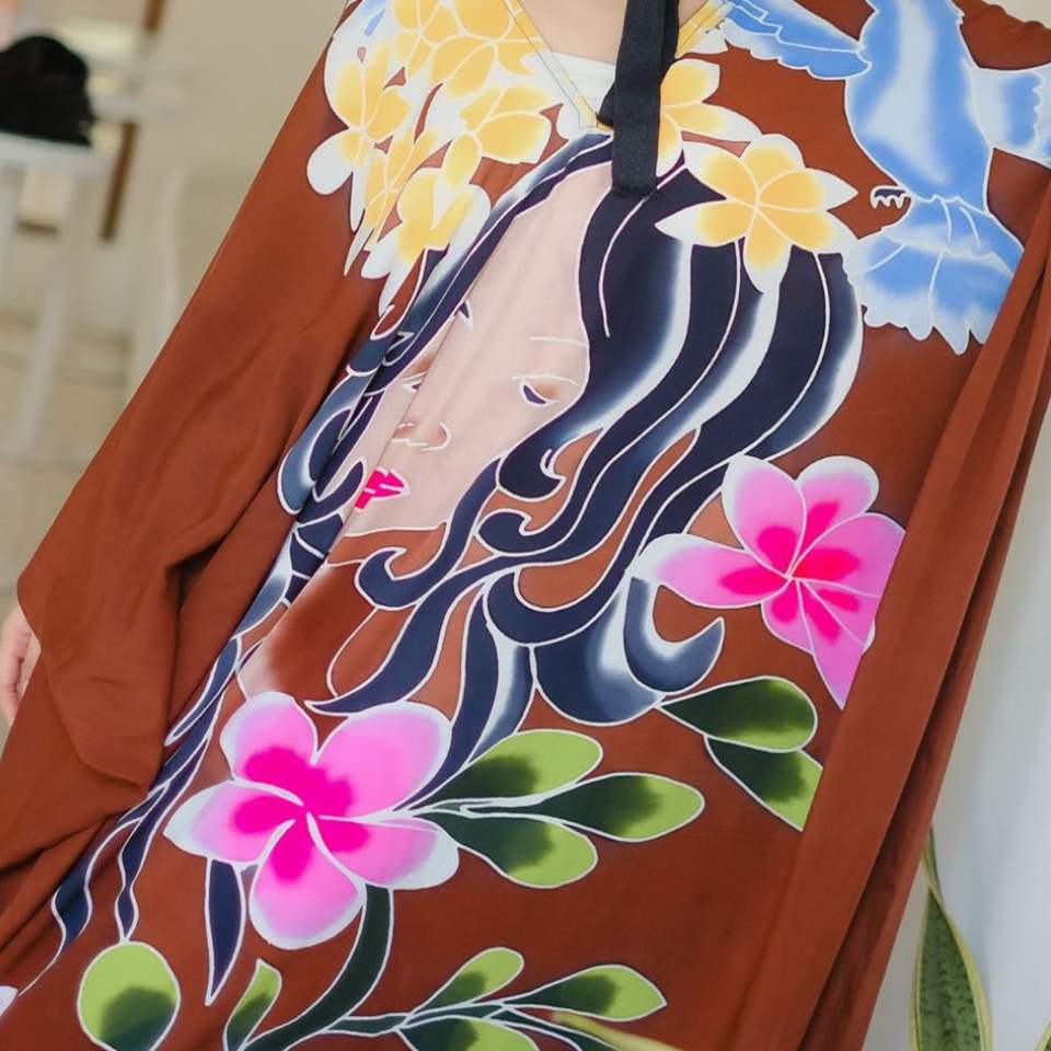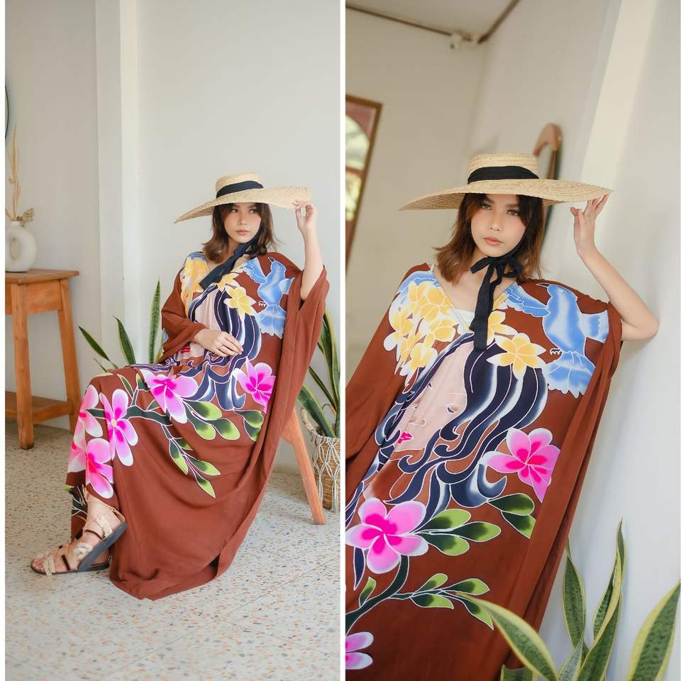 Java Garden Goddess Kaftan Vestido de rayón con estampado artístico con diseño de armonía de mujer y Flor de Indonesia