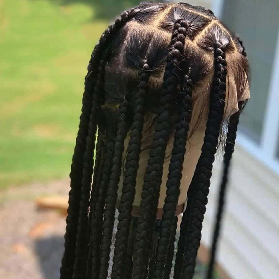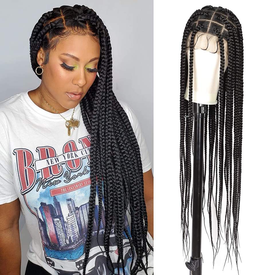 Pelucas trenzadas para mujeres, de 36 pulgadas cabellera larga, cuadrada y grande, con malla doble, color negro, sin nudo, con pelo de bebé