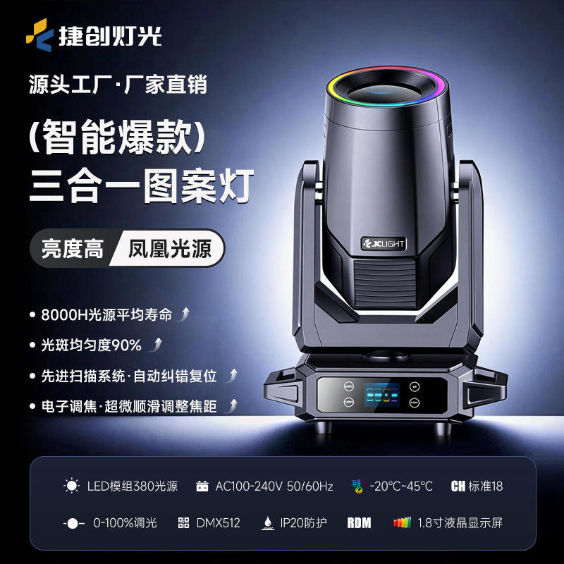 Luz móvil de patrones Jiechuang de 380W LED tres en uno para iluminación de escenarios en bodas, banquetes e ingeniería escénica