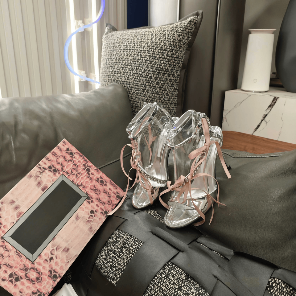 Jimmy - Zapatos de Tacón Alto con Correa en el Tobillo y Lazo de Pedrería para Mujer, Elegantes, con Punta Abierta, para Bodas, Fiestas y Eventos Nocturnos