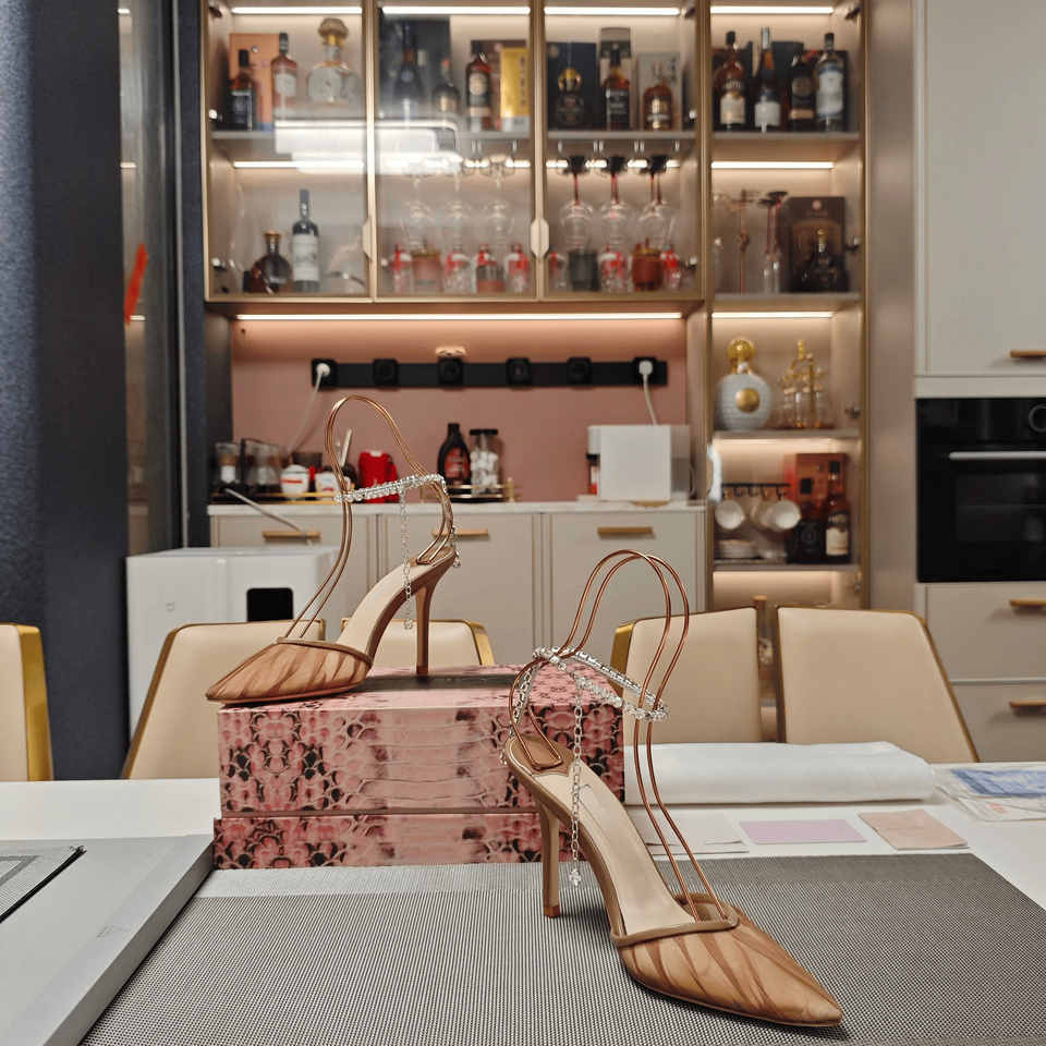 Jimmy - Tacones de aguja de malla transparente con cadena de diamantes de imitación y correa al tobillo para mujer, de punta, modernos, para fiesta, club, noche, o eventos.