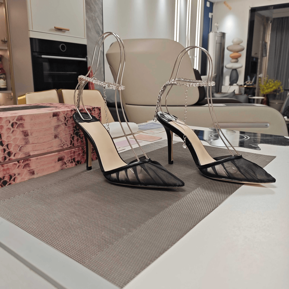 Jimmy - Zapatos de Tacón Alto con Tira en el Tobillo y Adornos de Pedrería para Mujer, Elegantes y Versátiles, con Punta en Pico, para Ocasiones Casuales y Formales
