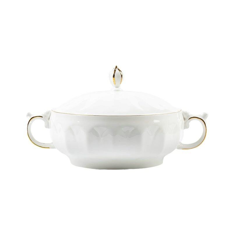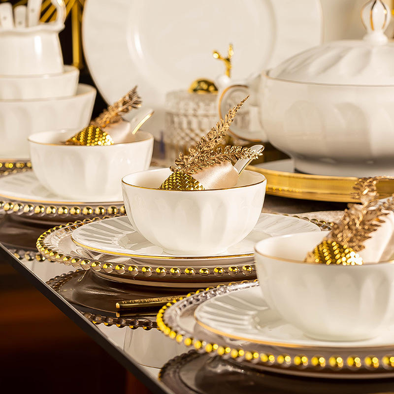Juego de vajilla de estilo europeo de gama alta Jingdezhen, platos de arroz de cerámica blanca pura desechables, borde dorado en relieve, Hogar Moderno