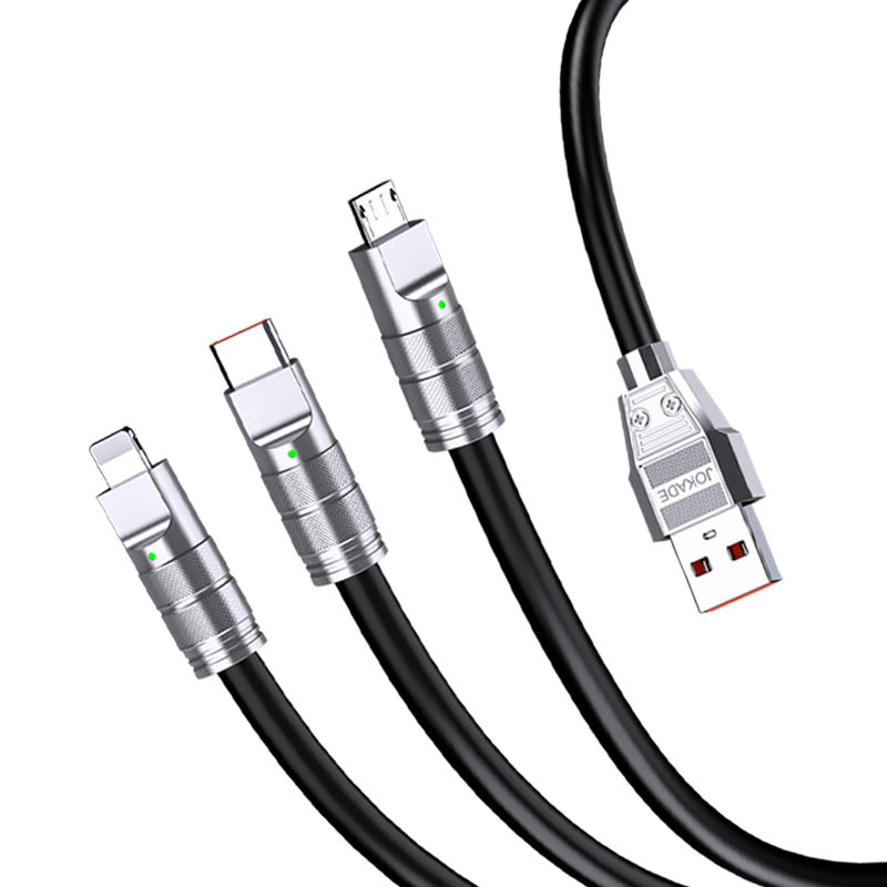 Cable de Carga 3 en 1 Jokade, USB a Lightning, Tipo C, Micro USB, 1.2m, 3A, Negro, Sincronización Rápida para Teléfonos y Tabletas