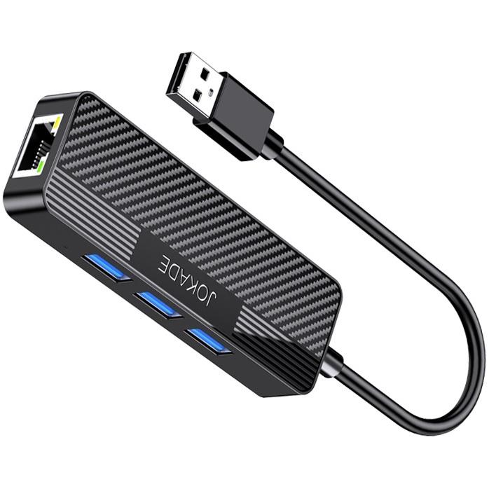 Adaptador Hub USB 4 en 1 Jokade, 3 Puertos USB 3.0 y 1 Puerto RJ45 Gigabit Ethernet, Negro
