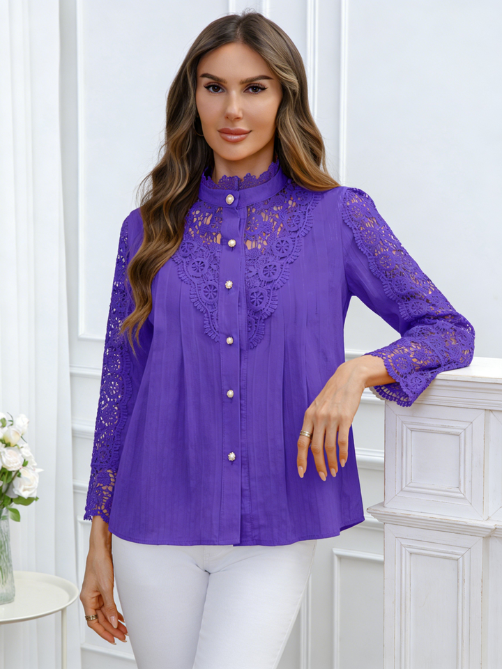 Blusa Joyinspring Primavera/Verano 2026, Talla Grande, Bordada, de Chifón Sólido, Casual, con Encaje, Cuello Redondo y Manga Larga