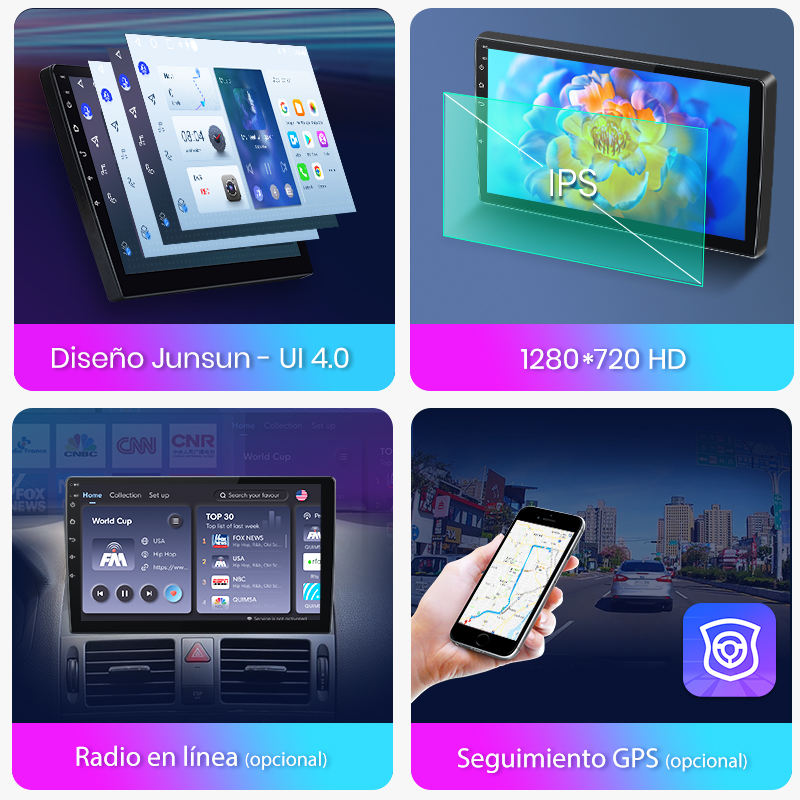 Compatible con Bluetooth, GPS incorporado, Reproductores MP3 / MP4, Sintonizador Radio, Pantalla táctil, DVR, Transmisor FM, Cámara de copia de seguridad, Puerto AUX, HDMI/Out, Invertir la ayudaCombinación