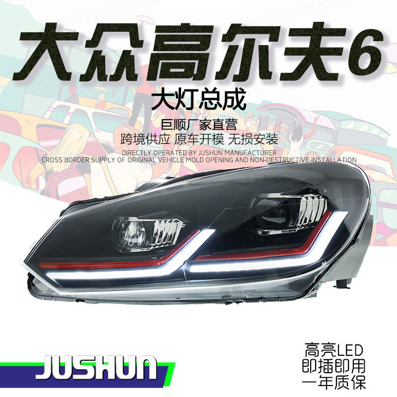 Jushun Volkswagen Golf 6 09-13 Conjunto de Faros Modificación Nuevo LED Lente Luz Diurna en Rojo Línea Plateada Material PC