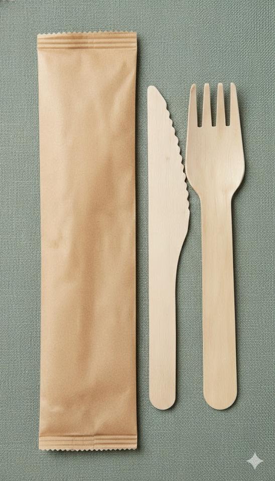 Cubiertos desechables de madera: cuchara, tenedor y cuchillo.Producción