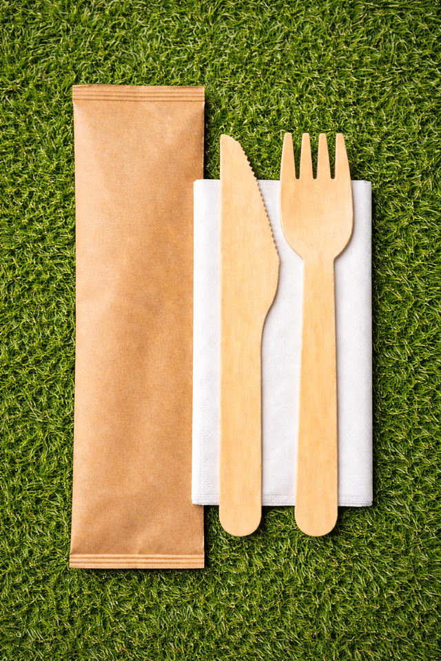 Cubiertos desechables de madera: cuchara, tenedor y cuchillo.Producción