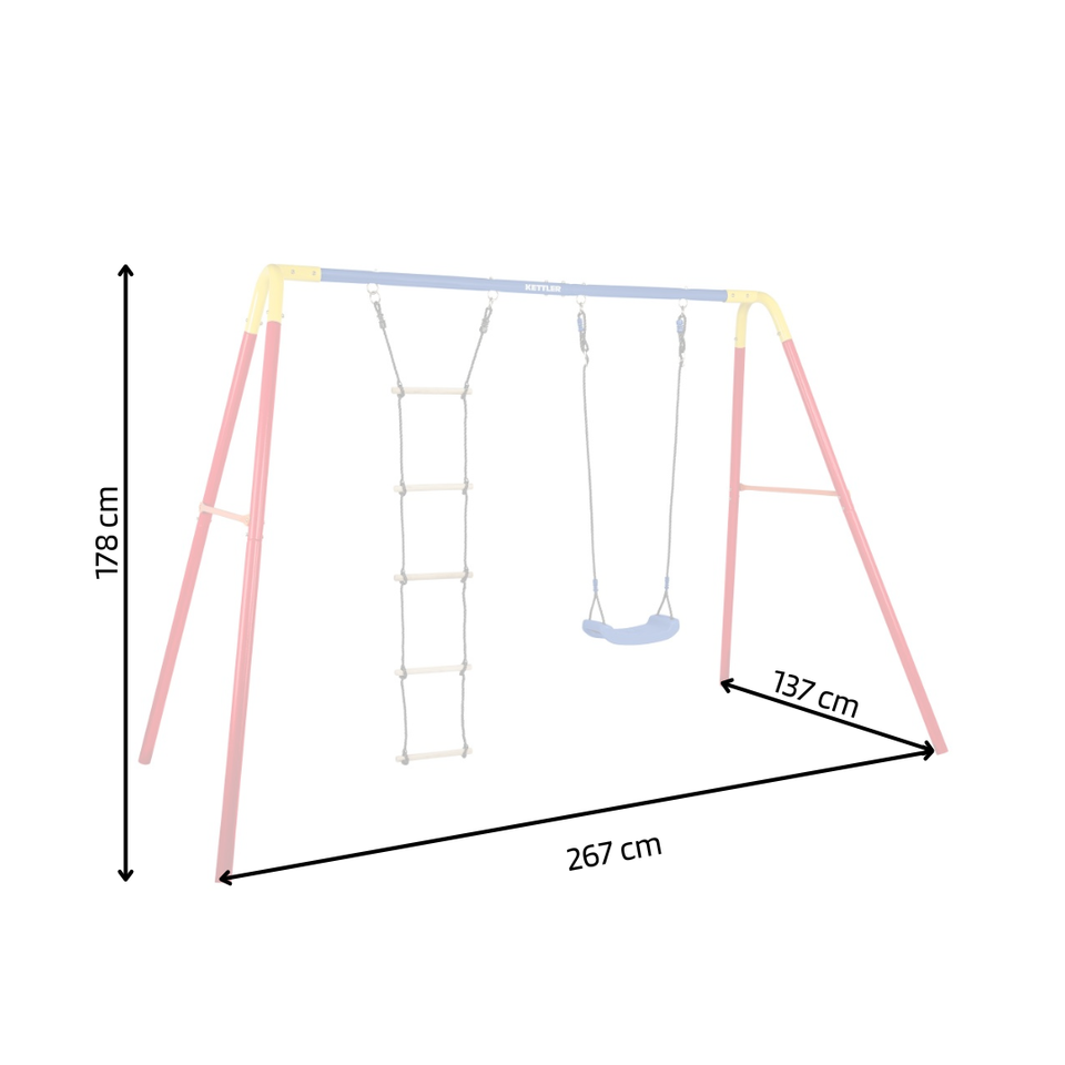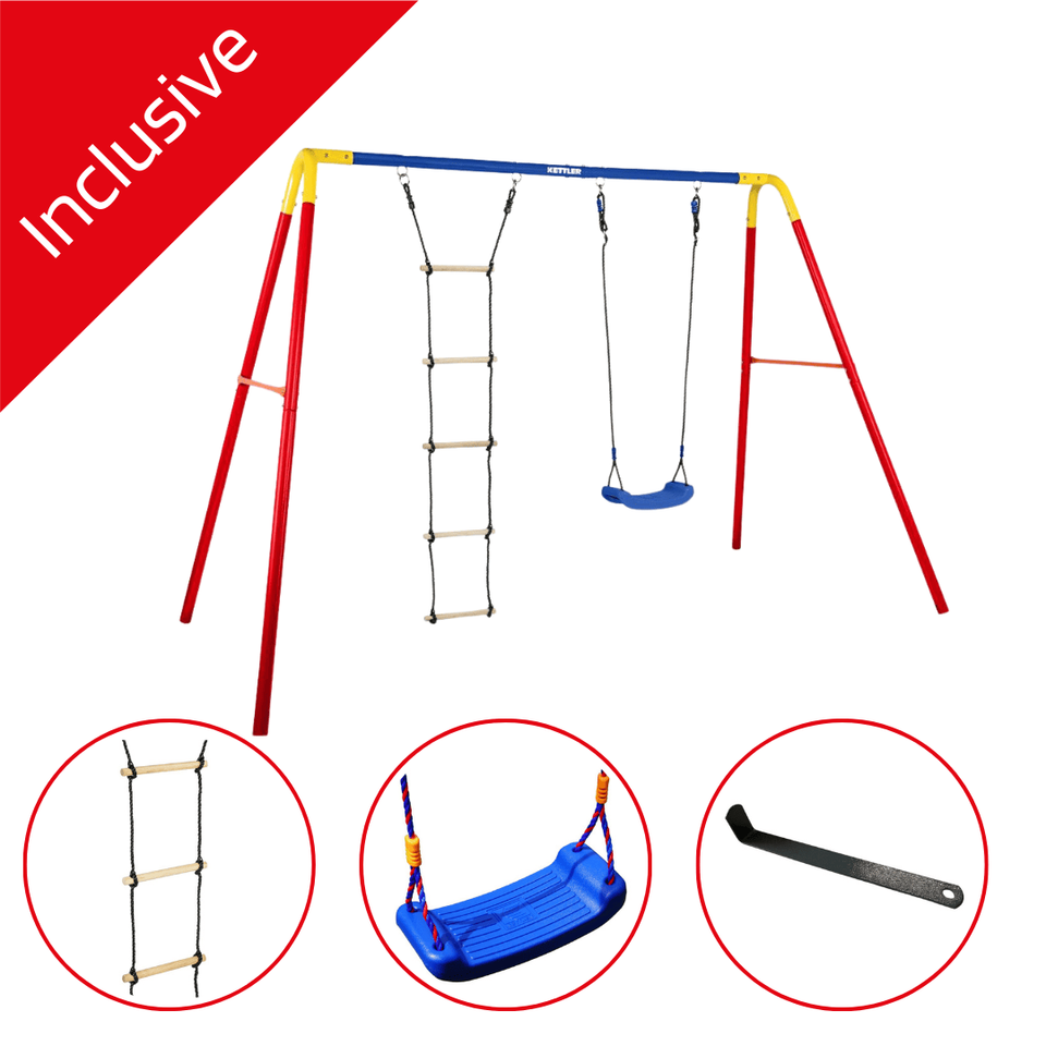 Kettler-Columpio doble COMBI, conjunto de silla columpio para exteriores rojo y azul, marco de columpio, escalera de asiento, anclajes de suelo, capacidad de carga máxima de 100kg